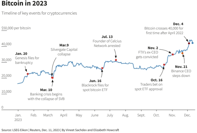 Большая часть роста биткойна пришлась на вторую половину года, когда ожидания запуска спотовых биржевых фондов биткойна (ETF) в США и надежды на смягчение денежно-кредитной политики вызвали прилив энергии у инвесторов.