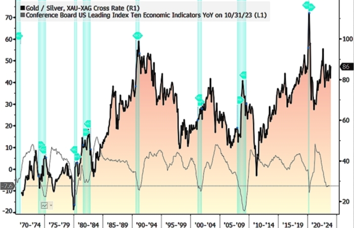 Отношение цен золота и серебра на 13 декабря составляло коэффициент на уровне 86. Этот коэффициент, вероятно, продолжит рост, если мировая экономика «пошатнется». По мнению экспертов Bloomberg, последствия того, что большинство центральных банков продолжали повышение ставок в 3 квартале 2023 года, инвертированная кривая доходности в США и ухудшение экономической ситуации в Европе и США указывают на грядущую рецессию. ФРС в 2024 г. может неохотно начать снижение ставок на фоне высокой инфляции и устойчивого фондового рынка, усугубляя неизбежность рецессии. Это может привести к тому, что соотношение золото/серебро вырастет до рекордно высокого уровня.