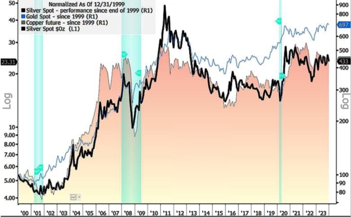 Цена серебра в середине декабря 2023 года была приблизительно такой же, как в 2010 году. В перспективе рынок серебра, скорее, может столкнуться с теми же негативными факторами, что и медь, нежели с теми же позитивными факторами, что и золото. Промышленное потребление серебра неуклонно растет, но не растет цена, особенно если сравнивать с динамикой золота. Основная причина этого, как и у меди — ухудшение экономического роста в Китае и продажи инвестиционных фондов. Как и в случае с золотом, в ETF-фондах, обеспеченных серебром, наблюдается отток средств, в то время как центральные банки скупают золото с головокружительной скоростью. Электрификация и декарбонизация являются надежными источниками долгосрочного спроса на серебро и медь. В ближайшей перспективе последствия экономического спада в результате самого агрессивного ужесточения политики мировых центральных банков в истории и растущая зависимость от стимулирующих мер Китая могут ограничить рост цен на серебро.