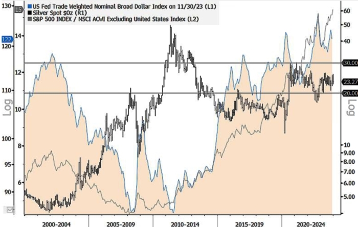 Серебру может потребоваться ослабление курса доллара, чтобы достигнуть и попытаться преодолеть сопротивление на уровне 30 долларов за унцию. Это может укрепить позиции золота. С 2011 года главным спутником укрепления доллара был американский фондовый рынок, который демонстрировал опережающую динамику относительно фондовых площадок в других странах. Это может предвещать потенциальный встречный ветер для серебра, поскольку для существенного ослабления курса доллара может потребоваться падение фондового рынка в Штатах.
