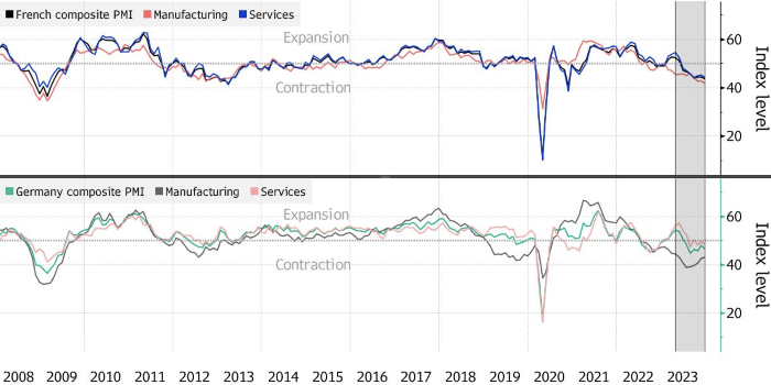 Деловая активность во Франции и Германии падает. Источник: Bloomberg