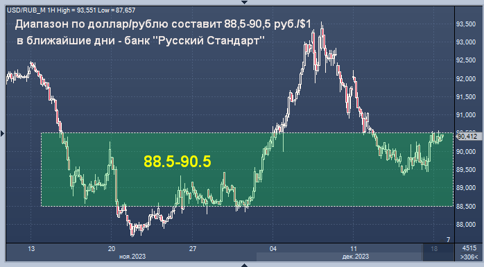Торговый диапазон по паре доллар/рубль, скорее всего, составит в ближайшие дни 88,5-90,5 руб./$1, по паре евро/рубль - 97,5-99,5 руб./EUR1, пишет директор департамента операций на финансовых рынках банка "Русский Стандарт" Максим Тимошенко.