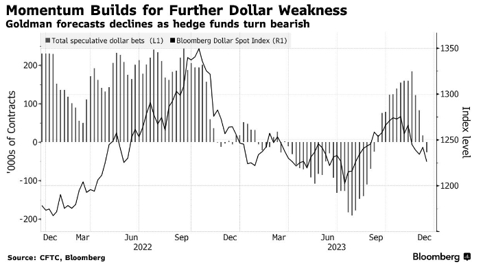 Спот-индекс доллара Bloomberg упал на 1,2% на прошлой неделе и коснулся четырехмесячного минимума после того, как ФРС сохранила процентные ставки и спрогнозировала снижение базовой ставки на 75 пунктов в 2024 году. Рынки поспешили заложить в цену целых шесть сокращений, а экономисты Goldman предположили пять.