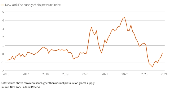 Индекс давления в цепочках поставок от ФРБ Нью-Йорка. Объединяет данные о транспортных расходв и производственные показатели. Позволяет оценивать состояние глобальных цепочек поставок. Значения выше нуля отражают ухудшение ситуации в цепочках поставок.
