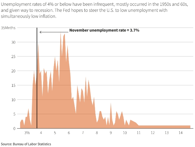 Сейчас уровень безработицы составляет 3,7% против 3,6%, когда ФРС начала повышать процентные ставки. Он был ниже 4% в течение 22 месяцев, что является самым продолжительным периодом с 1960-х годов и примерно таким же, как и перед пандемией.