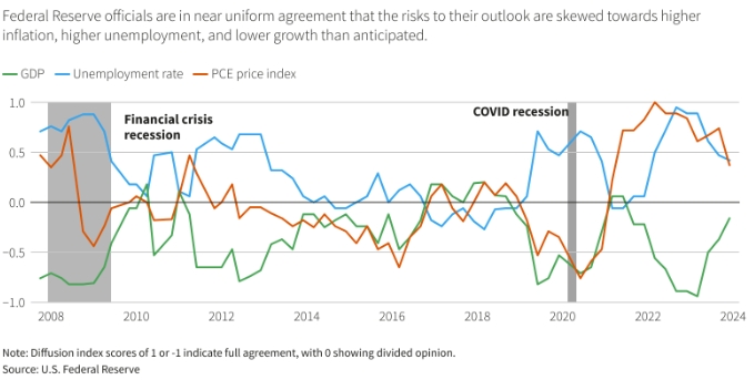 Дифузия прогнозов чиновников ФРС по ВВП США (зеленая линия), уровню безработицы (голубая), ценовому компоненту индекса PCE (оранжевая). Чиновники ФРС почти единодушны в том, что риски их прогнозов смещены в сторону более высокой (нежели ожидалось) инфляции, более высокой безработицы и более низкого экономического роста.