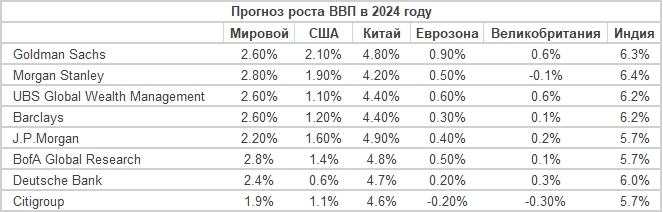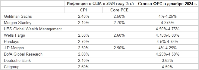 Ниже приведены прогнозы некоторых крупных банков и инвестиционных компаний по экономическому росту, инфляции, политике ФРС и ожидаемой динамики определенных классов активов.