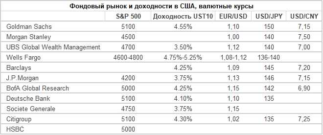 Прогнозы по фондовому рынку, доходностям гособлигаций США, валютным курсам.
