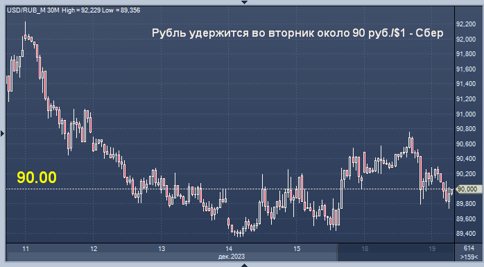 "Рубль в первой половине торгов понедельника дешевел и достиг 90,8 руб./$1, однако на этом уровне резко увеличились продажи иностранной валюты, и рубль укрепился на 1%, примерно до 90 руб./$1. Вероятно, рубль останется на этом уровне и во вторник", - считают эксперты Сбербанка.