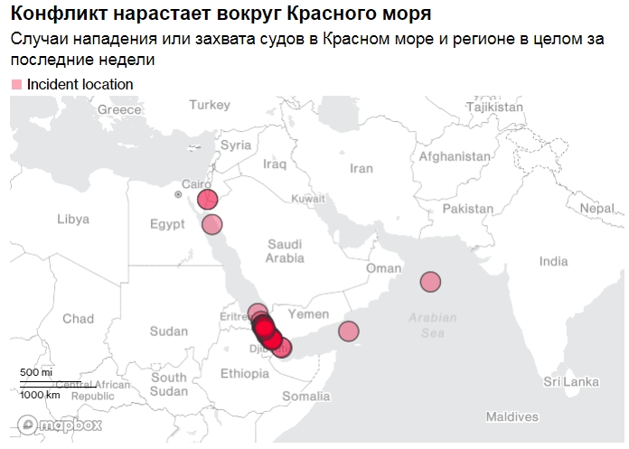Конфликт в акватории Красного моря нарастает. Случаи нападения или захвата судов в Красном море и регионе в целом за последние недели. Источник: Ambrey Analytics. Примечание: 19 ноября – 18 декабрь, включает попытки нападений.