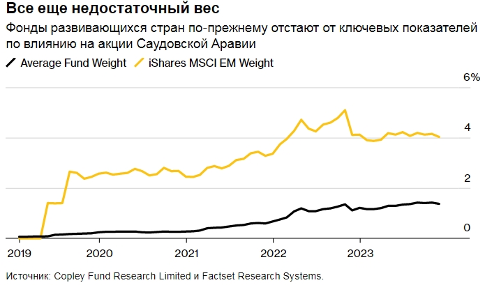По данным Copley Funds Research, существует 147 фондов развивающихся рынков с активами под управлением на сумму более 127 миллиардов долларов, которые никогда не инвестировали в Саудовскую Аравию. Но, как показывает исследование, портфельные управляющие продолжают поездки с целью изучения страны на месте для увеличения квот инвестирования: доля активных фондов развивающихся рынков, инвестирующих в королевство, с начала года увеличилась более чем вдвое.