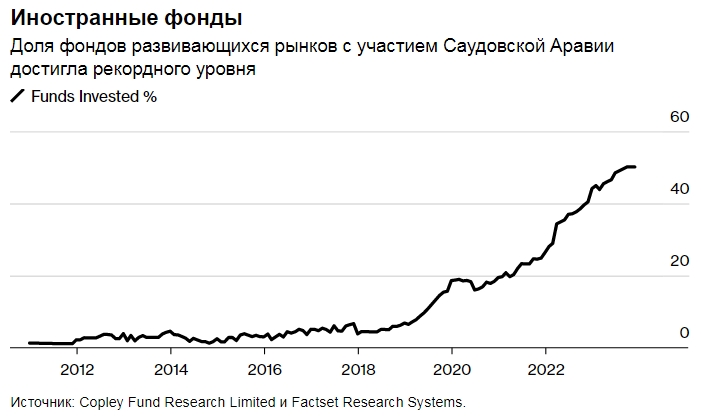 Иностранные фонды. Доля фондов развивающихся рынков с участием Саудовской Аравии достигла рекордного уровня. Источник: Copley Fund Research Limited и Factset Research Systems.