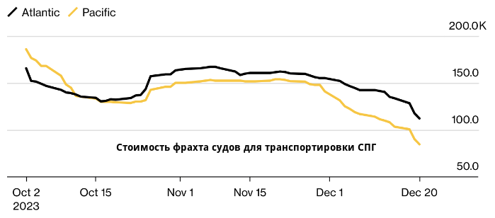 Цены на транспортировку СПГ начали падать в конце ноября и ускорились на этой неделе. По данным Spark Commodities, в тихоокеанском бассейне за день фрахта берут меньше $100 000 впервые с августа 2023 года. Тарифы в Атлантическом бассейне также снижаются. С пятницы они упали на 16%.