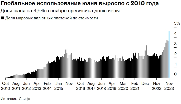 Доля сделок с юанями в общем объеме всех валют выросла в прошлом месяце до 4,6 % с 3,6 % в октябре. Этот показатель стал рекордным для юаня и превысил показатель иены в 3,4 %. Последний раз юань занимал четвертое место в рейтинге в январе 2022 года. Доллар США сохранил лидерство в ноябре с 47 %, за ним следуют евро и фунт стерлингов с 23 % и 7,15 % соответственно.