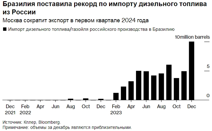 Бразилия поставила рекорд по импорту дизельного топлива из России. Москва сократит экспорт в первом квартале 2024 года. Источник: Kpler, Bloomberg. Примечание: объемы за декабрь являются приблизительными.