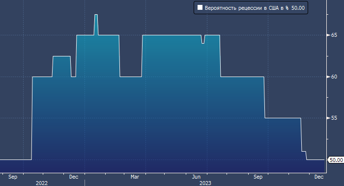 Кроме того, экономические перспективы США выглядят лучше перспектив других развитых стран и регионов мира. В частности, консенсус-прогноз экономистов, за которыми следит Bloomberg, предполагает 50-процентную вероятность рецессии в США в ближайшие 12 месяцев (см. график ниже), тогда как аналогичный показатель для Еврозоны составляет 65%.