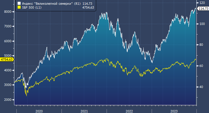 «Локомотивом опережающей динамики индексов акций американских технологических компаний выступила „Великолепная семерка“: Alphabet, Amazon, Apple, Meta Platforms (признана в России экстремистской организацией, ее деятельность запрещена), Microsoft, NVIDIA и Tesla», — пишет Альберт Эдвардс.