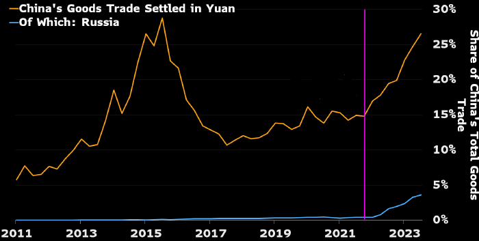 В январе 2022 года, незадолго до начала СВО, Россия продавала за юани лишь 4% своего экспорта и оплачивала юанями лишь 24% своего импорта из Китая. К сентябрю 2023 года, т. е. после всех санкций Запада, 83% российского экспорта в Китай и 100% импорта из Китая оплачивались в юанях.