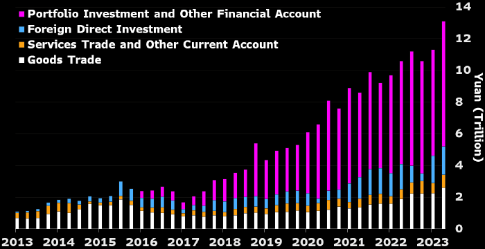 Структура трансграничных операций Китая в трлн юаней: фиолетовым — портфельные инвестиции и другие финансовые операции, голубым — прямые иностранные инвестиции, оранжевым — торговля услугами, белым — торговля товарами. Источник: Bloomberg