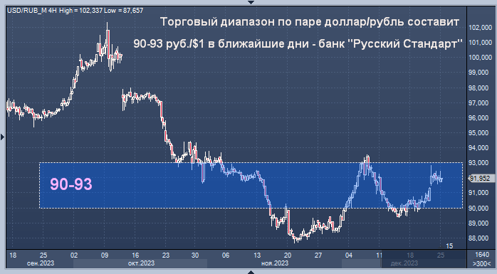Волатильность может усилиться на этой неделе из-за снижения ликвидности перед новогодними праздниками. Рубль продолжит тяготеть к уровням 90 руб./$1 при поддержке налогового периода. Но спрос уезжающих в отпуск за границу россиян на валюту сдержит укрепление национальной валюты.