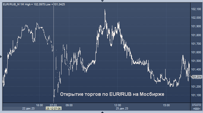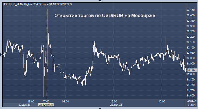 Сессия на внутреннем валютном рынке проходит в спокойном режиме, так как большинство ведущих мировых рынков, в том числе рынок энергоносителей, не функционируют в связи с рождественскими праздниками. В понедельник закрыты биржи США, Великобритании, Германии, Франции и других стран Европы, а также Гонконга, Южной Кореи и Австралии.