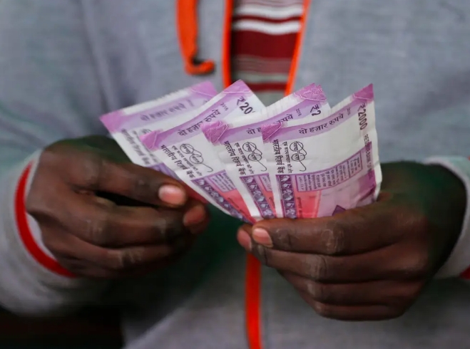 Торговец пересчитывает новые банкноты номиналом 2000 рупий на оптовом овощном рынке в Бангалоре, Индия. AP Photo/Айджаз Рахи