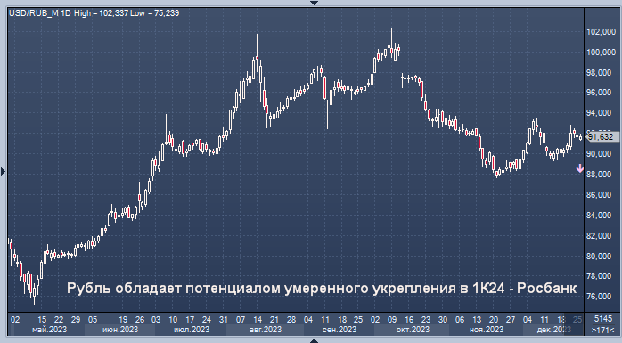"Поддержка со стороны экспортеров сохранится, а операции Банка России как минимум в начале года будут направлены на продажу юаней. По нашим расчетам, для перехода регулятора к покупкам юаней среднегодовая цена нефти марки Urals должна быть не менее $75/баррель при курсе пары USD/RUB на уровнях 90-95 руб./$1. Минфин при подготовке бюджета на 2024 год исходил из цены $71,3/баррель и курса на уровне 90 руб./$1", - считают аналитики Росбанка.