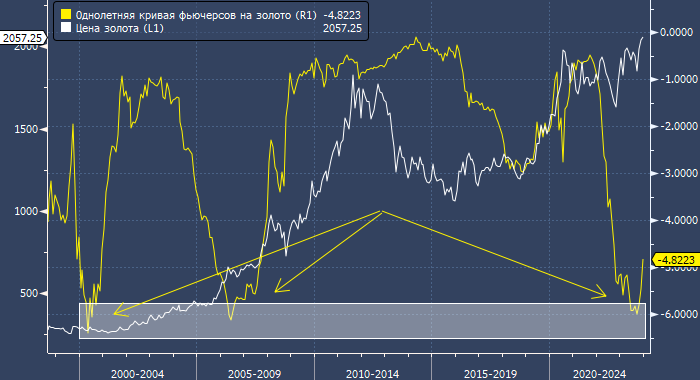 На приведенном выше графике видно, что в предыдущих двух случаях, когда контанго достигало схожей глубины, цена золота вскоре показывала мощный рост. В частности, в 2001 году драгметалл начал 12-летний период роста, а в 2007 году он показал максимальный с 1979 года процентный прирост в 31%.