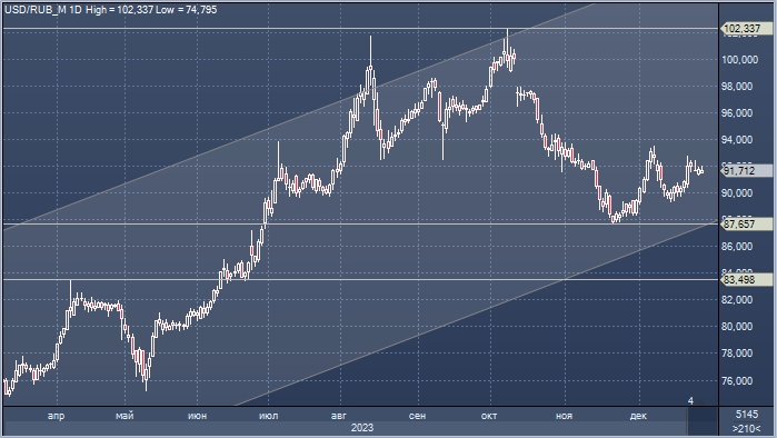 На прошлой неделе на Совете по стратегическому развитию и национальным проектам первый вице-премьер РФ Андрей Белоусов сказал, что Российская экономика вышла на точку равновесия экспорта и импорта, валютный курс стабилизировался на уровне 90 рублей за доллар США, что приемлемо как экспортерам, так и потребительскому и инвестиционному рынкам. В итоге аналитики ожидают, что курс российской валюты к доллару завершит 2023 год близко к отметке, которую Андрей Белоусов назвал приемлемой, для большинства участников рынка.