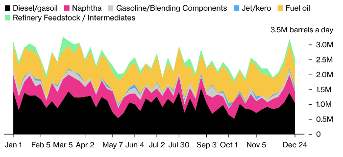 Еженедельные отгрузки дизеля, газойля, нафты, авиационного топлива из России. Источник: Bloomberg