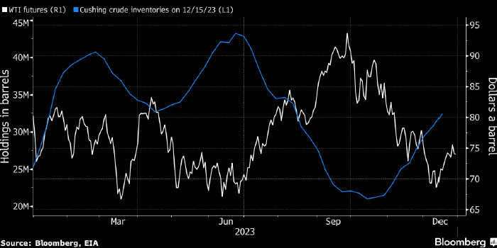Цена нефти WTI (белым, правая шкала) и запасы нефти в Кушинге (синим, левая шкала, в млн баррелей). Источник: Bloomberg