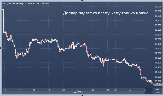 Индекс доллара, который измеряет курс американской валюты по отношению к шести валютам-конкурентам, упал до нового пятимесячного минимума в 100,63. Индекс находится на пути к снижению на 2,7% в этом году, прервав два года подряд сильного роста.