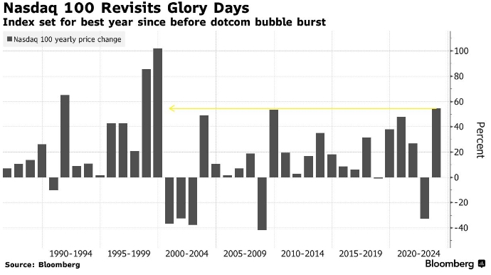 График процентных изменений по итогам календарного года индекса Nasdaq 100