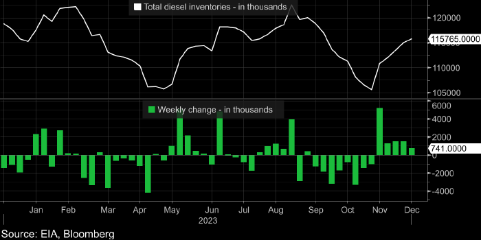 Запасы дизеля выросли на 0,74 млн баррелей.