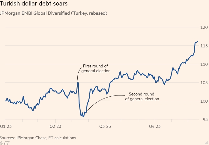 Долларовые облигации Турции резко выросли в 2023 году, продемонстрировав самый большой прирост среди всех ведущих компонентов индекса фиксированной доходности ведущих развивающихся рынков, поскольку инвесторы приветствовали возвращение страны к более традиционному курсу в денежно-кредитной политике.