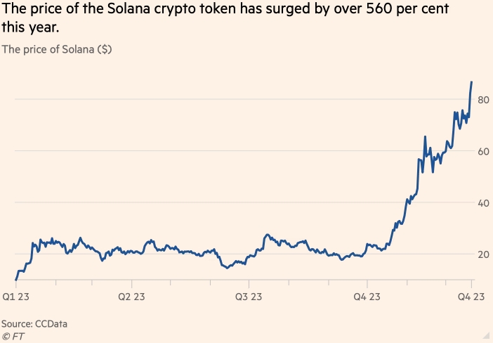 Одним из крупнейших сторонников Соланы был Сэм Бэнкман-Фрид, исполнительный директор обанкротившейся криптовалютной биржи, который разрекламировал ее как цифровой реестр, способный обрабатывать тысячи сделок в секунду — технологическое препятствие, которое оказалось не под силу многим криптовалютам, включая биткоин. Когда FTX рухнула, у нее была большая доля токенов Solana. Наряду с проблемами с надежностью, которые преследовали токен, это привело к тому, что цена, когда-то достигавшая 250 долларов, упала до всего лишь 13 долларов в начале 2023 года.