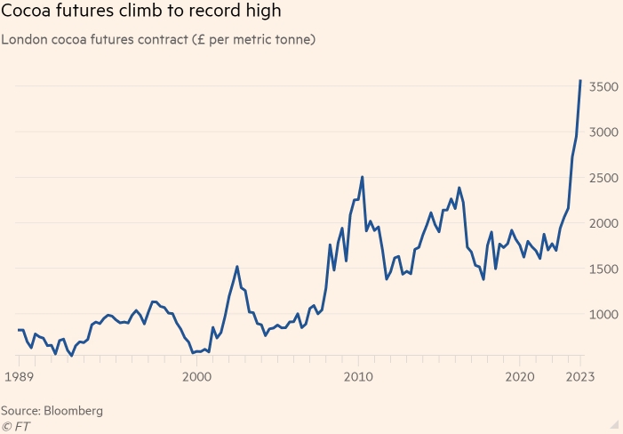 Фьючерсы на какао поднялись до рекордно высокого уровня, поскольку экстремальные погодные условия уничтожили посевы в Западной Африке, что привело к снижению поставок и росту цен на шоколад для мировых потребителей.