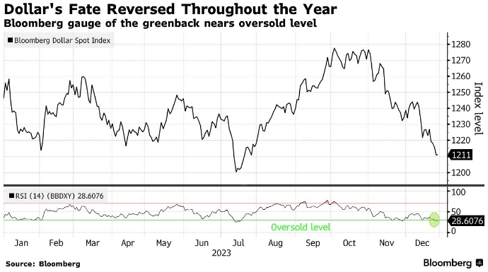 После фальстарта, когда в начале года все были уверены в прекращении повышения ставок ФРС, рынок все же увидел «голубиный» разворот. И по итогам года индекс доллара США от Bloomberg теряет почти 3%, что стало самым резким годовым падением американской валюты с 2020 года.
