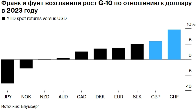 Франк и фунт возглавили рост G-10 по отношению к доллару в 2023 году. Источник: Блумберг