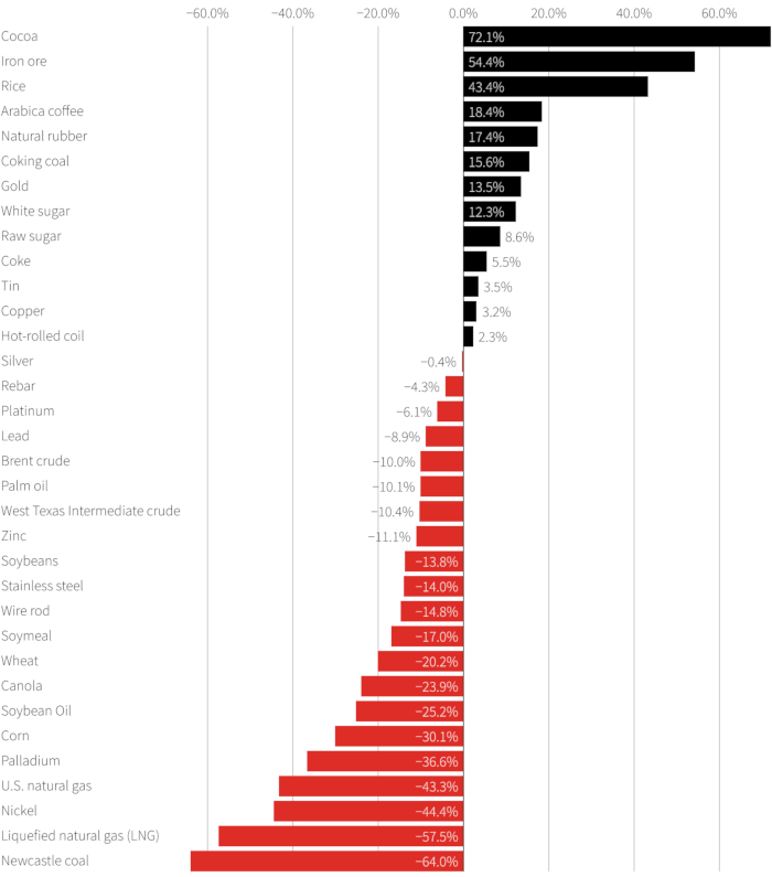 Цены на какао выросли на 72% до многолетнего максимума из-за сокращения предложения, а цена железной руды выросла почти на 55%, поскольку Китай активно пополнял запасы ЖРС.