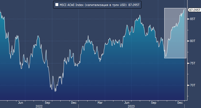 Благодаря этому капитализация фондового индекса MSCI ACWI* подскочила за последние два месяца на $10 трлн с лишним, капитализация всего мирового рынка акций прибавила свыше $13 трлн, а мирового рынка облигаций — $6,1 трлн (данные Bloomberg). Таким образом, совокупный прирост стоимости мировых рынков акций и облигаций составил с конца октября почти $20 трлн.