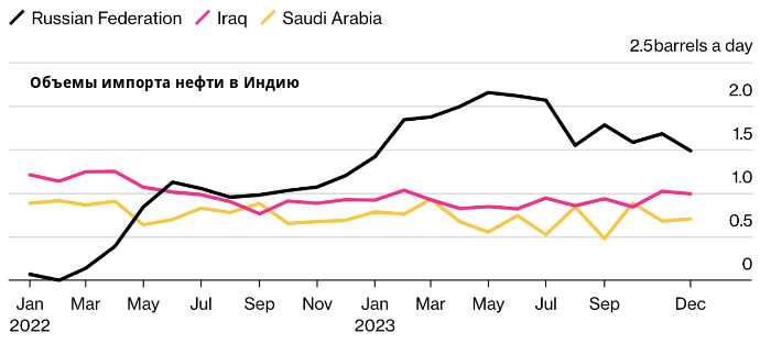 В мае объем импорта из России достиг рекордных 2,15 млн баррелей в день и с тех пор постепенно снижался. В декабре 2023 года он достиг 1,48 млн баррелей в день.