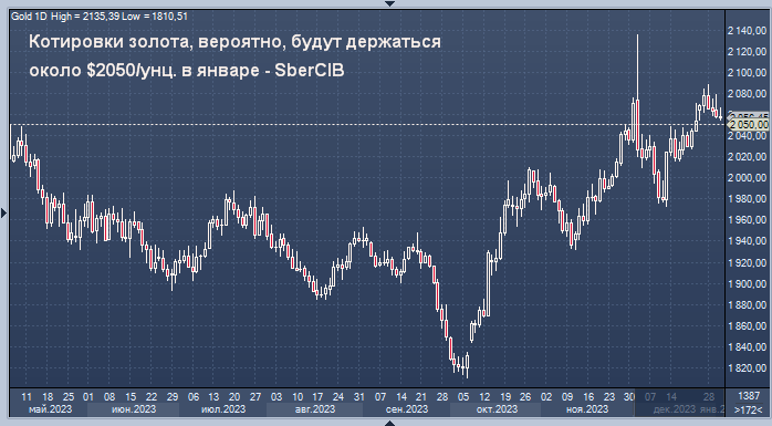 Мы полагаем, что в январе цена на золото останется выше $2000 за тройскую унцию и будет держаться вблизи $2050", - пишет старший аналитик SberCIB Investment Research Анна Пильгунова.