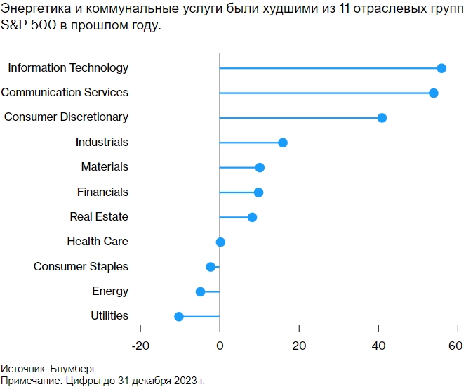 Энергетика и коммунальные услуги были худшими из 11 отраслевых групп S&P 500 в прошлом году. Источник: Блумберг. Примечание. Цифры до 31 декабря 2023 г.
