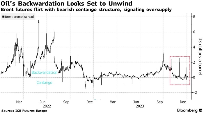 Нефть только что пережила первое годовое падение с 2020 года. И хотя не существует хрустального шара, чтобы определить, что ждет нас в 2024 году, ясно одно: предложение останется определяющим фактором. Рекордный объем добычи в США и рост производства в странах, не входящих в ОПЕК+, способствовали глобальному перенасыщению, несмотря на обещания Организации стран-экспортеров нефти сократить поставки. Инвесторы обратили внимание на это: спрэд на срочном рынке Brent снова оказался в состоянии "контанго" - "медвежьей" рыночной структуре, сигнализирующей об избыточном предложении, когда нефть ближайшей поставки стоят дешевле нефти дальней поставки. UBS Group AG стал последним крупным банком, который снизил свои прогнозы по мировому нефтяному эталону в связи с увеличением свободных производственных мощностей картеля. Ожидается, что в этом году Brent будет находиться в торговом диапазоне от 80 до 90 долларов за баррель.