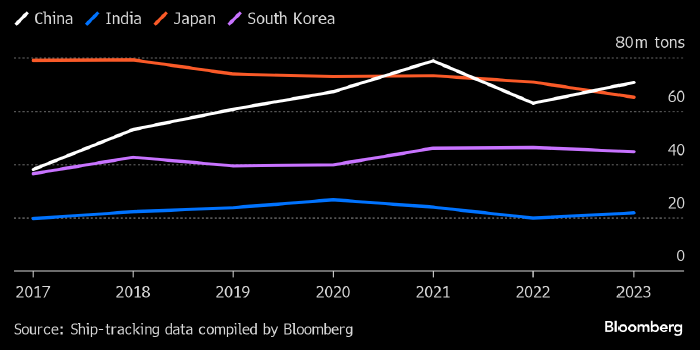 Импорт СПГ по странам в млн тонн в год: Китай (белым), Индия (голубым), Япония (оранжевым) и Южная Корея (фиолетовым). Данные и источник: Bloomberg