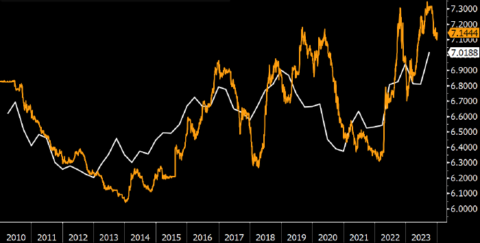 Модель BEER, которую использует Bloomberg для расчета «справедливых» курсов валют, показывает, что юань несколько недооценен к доллару. «Справедливый» курс USDCNY, по ее оценке, находится на уровне 7,0188, т. е. примерно на 2% ниже текущих котировок пары.