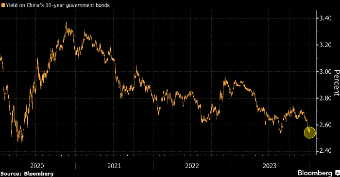 Доходность 10-летних гособлигаций Китая. Источник: Bloomberg