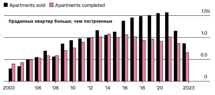 Вторая по величине экономика мира находится в разгаре многолетнего спада, вызванного отчасти политикой президента Си Цзиньпина, направленной на подавление спекуляций с недвижимостью. Застройщики завалены «мертвыми квартирами» — теми, которые были куплены, но так и не построены. По оценкам Nomura Securities Co., было продано около 20 млн квартир, строительство которых было отложено или еще не началось. Те, кто ждет своих новых квартир, становятся все более нетерпеливыми, превращая этот вопрос в потенциальную угрозу социальной стабильности. Власти пообещали остановить каскад дефолтов девелоперов — катастрофу, которая охватит банковский сектор и потенциально обречет Китай на потерянное десятилетие, подобное тому, в которое угодила Япония. Не исключено, что в этом году на смену вялым государственным подачкам придет полномасштабная помощь.