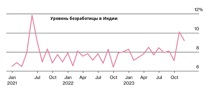 Китай растет уже не так быстро, поэтому экономисты теперь делают ставку на Индию, надеются, что она возьмет на себя функции мирового локомотива. Ожидания явно завышенные, а с учетом того, что премьер-министру Нарендре Моди предстоят выборы где-то в апреле или мае, проблема может лишь усугубиться. Экономисты Goldman Sachs Group Inc ожидают, что увеличение государственных расходов станет основным драйвером роста до голосования, а инвестиции частного сектора возьмут верх во второй половине года. Между тем Индия растет быстрее, чем любая другая крупная экономика, уровень безработицы в октябре превысил 10%, что, по данным Центра мониторинга индийской экономики, является самым высоким показателем за два года. Более того, уровень участия женщин на рынке труда застрял ниже 60%. Экономисты HSBC Holdings Plc говорят, что, даже если экономический рост может ускориться до 7.5% в год в течение следующего десятилетия, будет создано только около 45 млн из 70 млн рабочих мест, необходимых для удовлетворения потребностей растущего населения Индии, в результате чего 25 млн человек останутся без работы.
